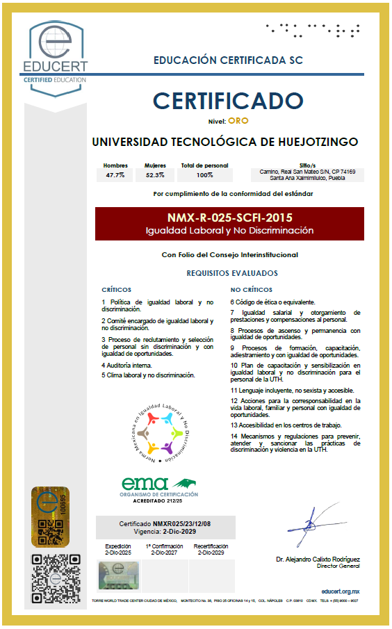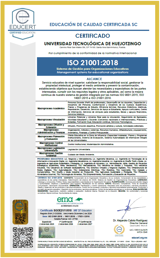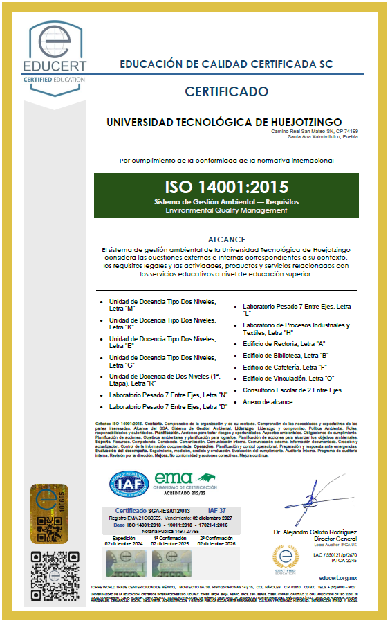 La Universidad Tecnológica de Huejotzingo como una institución de educación superior alineada a su misión y visión, establece los compromisos de: ofrecer servicio educativo de nivel superior; satisfacer la responsabilidad social, gestionar la propiedad intelectual, proteger el medio ambiente y prevenir la contaminación; estableciendo objetivos que buscan atender las necesidades y expectativas de las partes interesadas, cumplir con los requisitos legales y otros aplicables, así como la mejora continua de nuestro sistema de gestión integrado por las normas: ISO 9001:2015, ISO 14001:2015 e ISO 21001:2018. |